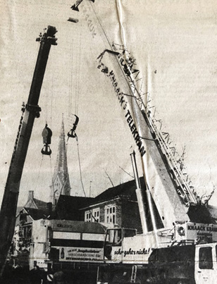 Die „größte Waschmaschine Dithmarschens“ wird mit zwei Kränen in die Halle an der Feldstraße