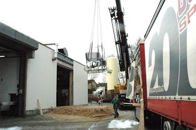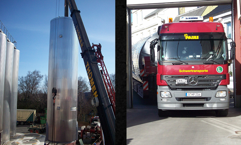 In die Produktionshalle wird ein neuer, 20.000 Liter fassender, Edelstahltank durch das geöffnete Dach gehoben. Darin wird die Würze als Vorstufe des Biers in Drehbewegung gesetzt, damit sich die natürlichen Trübstoffe absetzen. Der neue Behälter ersetzt den alten, der seit 1966 in Betrieb und mittlerweile reparaturbedürftig war.