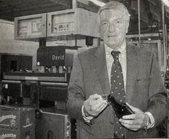 Ein neuer Leerflascheninspektor, vor dem Geschäftsführer Christoph Steding auf dem alten Zeitungsfoto steht, dient zur Qualitätssicherung und erkennt auch den kleinsten Haarriss im Leergut.